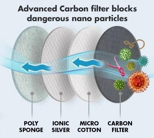 Medical-grade carbon filter (PM2.5) traps and filters air molecules from deadly viruses, flu and bacteria. Filters 95.99% of viruses including Coronavirus, bacteria, dust, chemicals, particles, pollen and smoke.